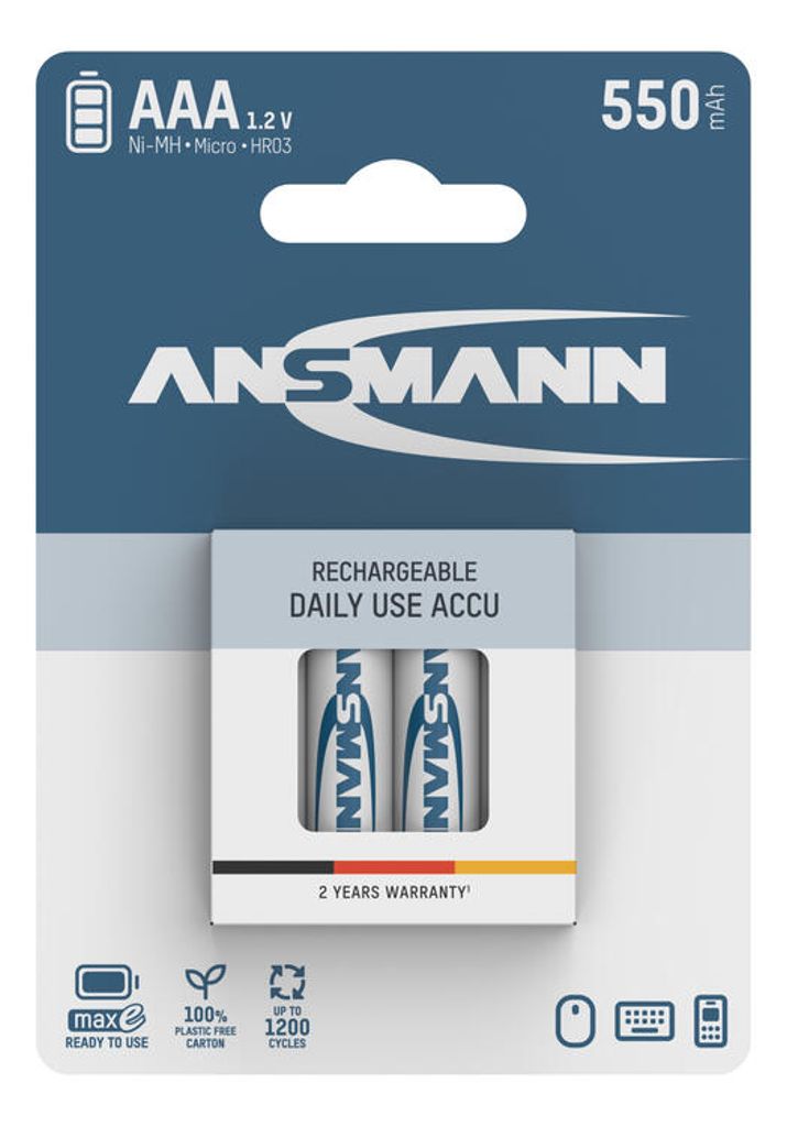 ANSMANNin Micro AAA -kokoiset NiMH-akut maxE-teknologialla tarjoavat korkeaa laatua, pitkän käyttöiän ja alhaisen itsepurkautumisen. Edistyksellisen teknologian ansiosta jopa noin 80 % alkuperäisestä kapasiteetista säilyy vuoden varastoinnin jälkeen , minkä ansiosta akut ovat käyttövalmiita myös pidemmän varastoinnin jälkeen.