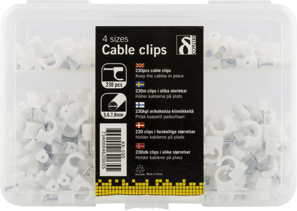 Deltaco muoviset kaapelikiinnikkeet teräsnauloilla – 230 kpl pakkaus, 4 kokoa